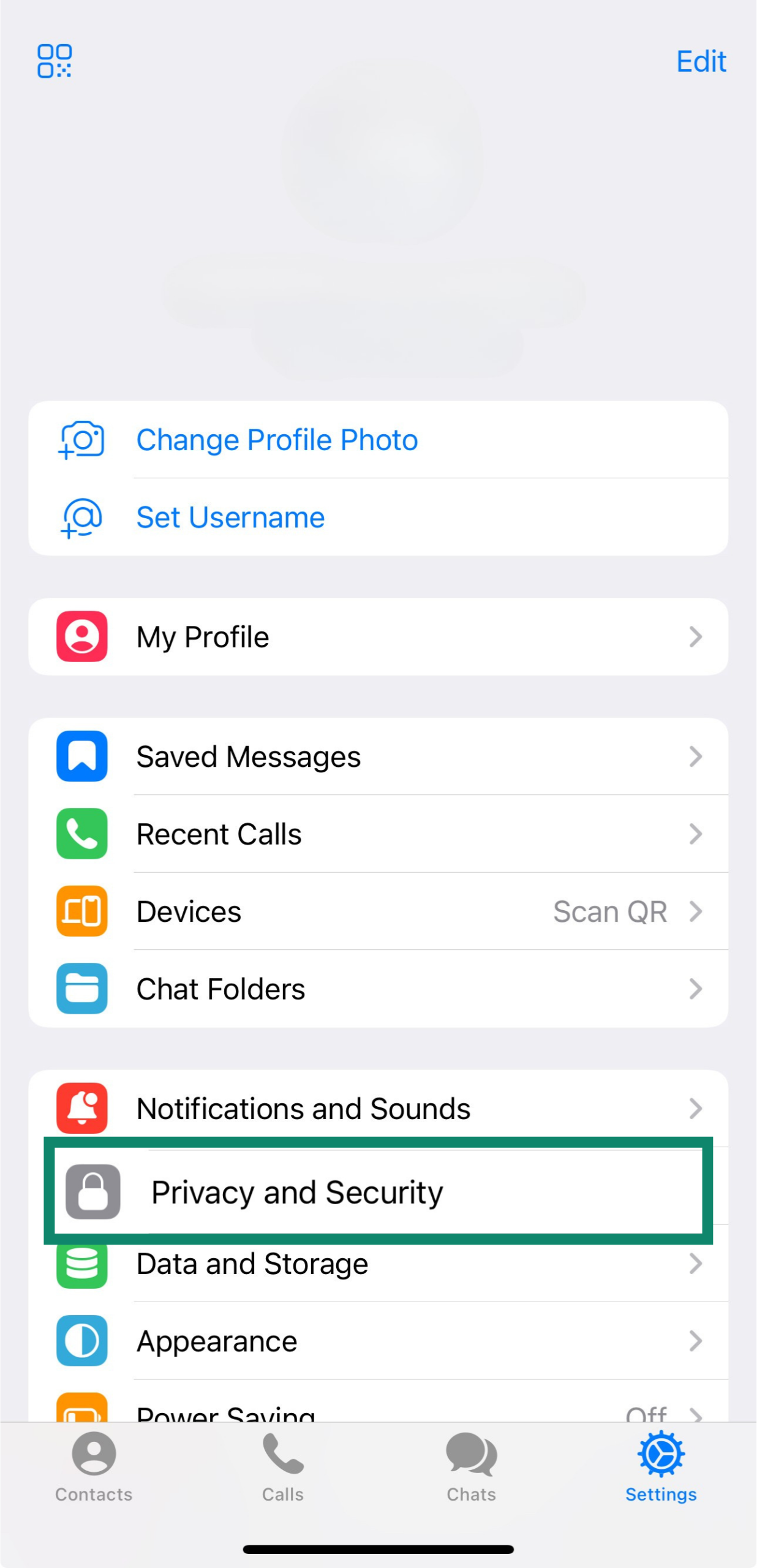 1. Go to Settings.Telegram app settings page showing profile, privacy, and security options.