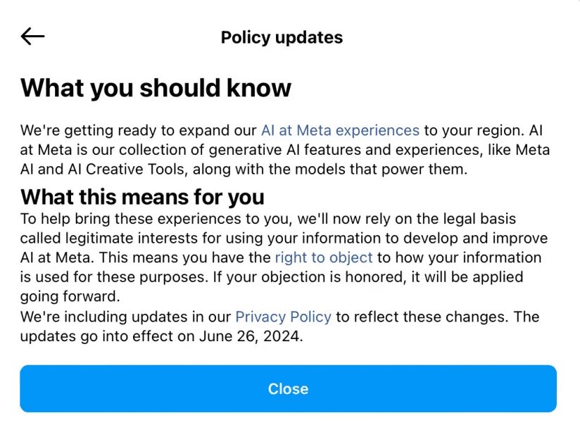 In the European Union (EU), the General Data Protection Regulation (GDPR) provides a way for users to opt-out. However, Meta has made this process unnecessarily complex. Notifications sent to users feature prominent “close” buttons, while the actual opt-out links are hidden in tiny, hard-to-see text.