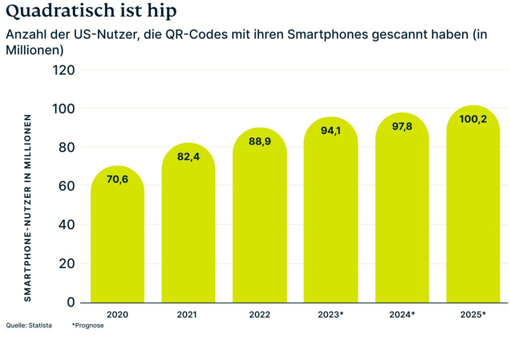 Aller Wahrscheinlichkeit nach werden diese kleinen Schwarz-Weiß-Muster dank ihrer Verfügbarkeit und der einfachen Nutzung auch weiterhin in verschiedenen Aspekten unseres Alltags auftauchen. Tatsächlich hat eMarketer vorausgesagt, dass die Anzahl der QR-Code-Scans bis zum Jahr 2035 mit voraussichtlich 100 Millionen Scans um 19 % steigen wird (im Vergleich zu den Statistiken aus dem Jahr 2022).