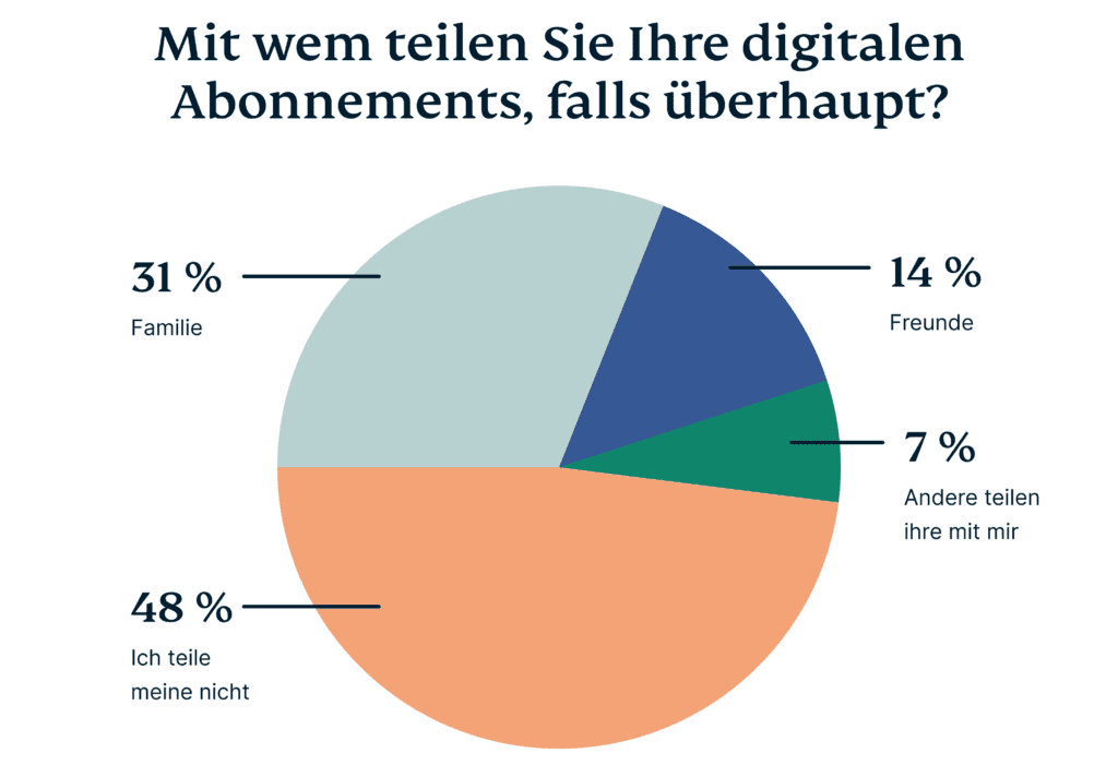Laut unserer Umfrage teilen 31 % der Menschen ihre digitalen Abonnements mit Familienmitgliedern, während 14 % diese auch mit Freunden teilen. Auf der anderen Seite nutzen 7 % der Befragten Abonnements, die von jemand anderem bezahlt werden. Das bedeutet, dass fast die Hälfte aller Nutzer an irgendeiner Form des Abonnement-Sharings beteiligt ist.