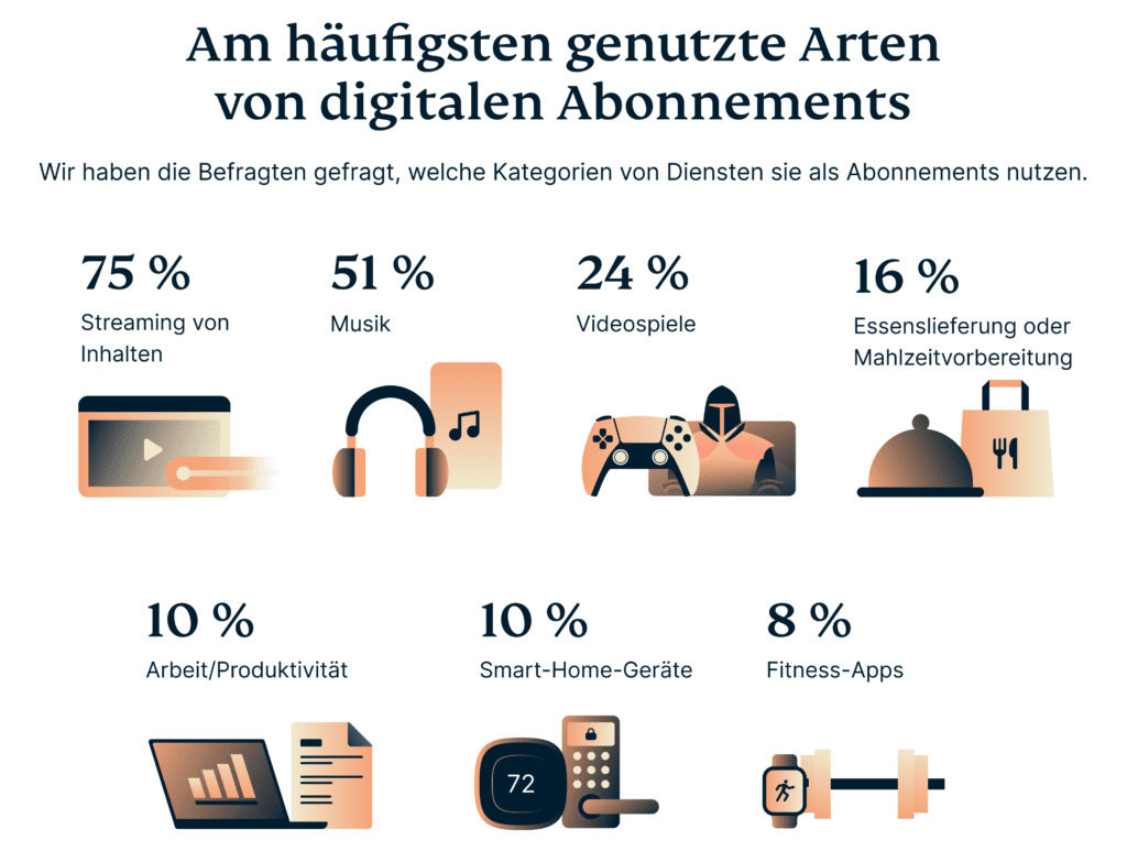 Da so viele Abonnementdienste um unsere Aufmerksamkeit (und unser Geld) wetteifern, lohnt es sich, genauer hinzusehen, wofür die Menschen tatsächlich ihr Geld ausgeben. In unserer Umfrage haben wir die Teilnehmer gefragt, welche Arten von digitalen Abonnements sie am häufigsten nutzen, unabhängig davon, ob sie diese selbst bezahlen.