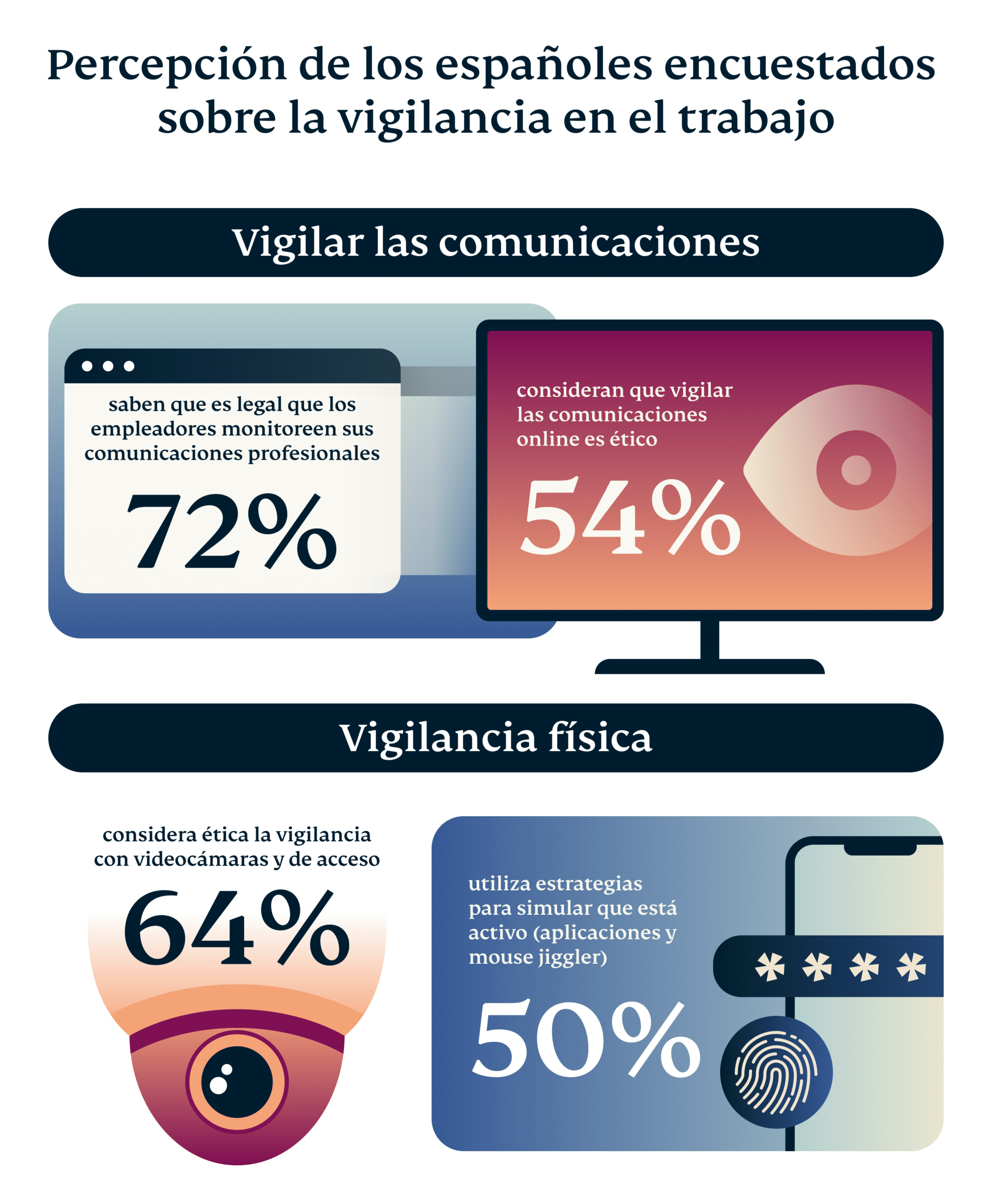 Una técnica habitual es el rastreo de comunicaciones online relacionadas con el trabajo (emails, chats, reuniones online…). Una mayoría de los encuestados (72%) es consciente de que esta técnica es legal, si se hace por razones legítimas, aunque el 46% considera que vigilar estas comunicaciones no es ético. Un 64% de los encuestados, en cambio, sí estaría dispuesto a aceptar la vigilancia física (a través de videocámaras o el rastreo de su tarjeta de acceso a la empresa, por ejemplo), por encima de quienes consideran que la vigilancia digital no es ética.