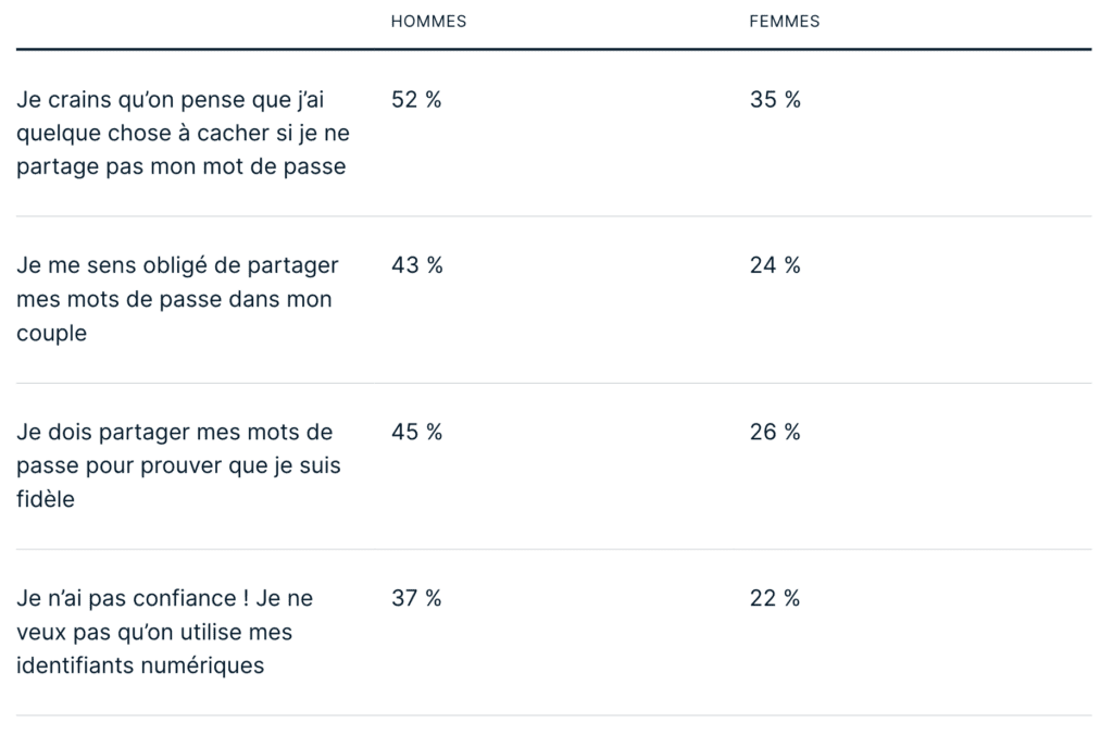 Il est intéressant de noter que les hommes affirment plus souvent ressentir une pression les contraignant à partager leurs mots de passe avec leurs partenaires.