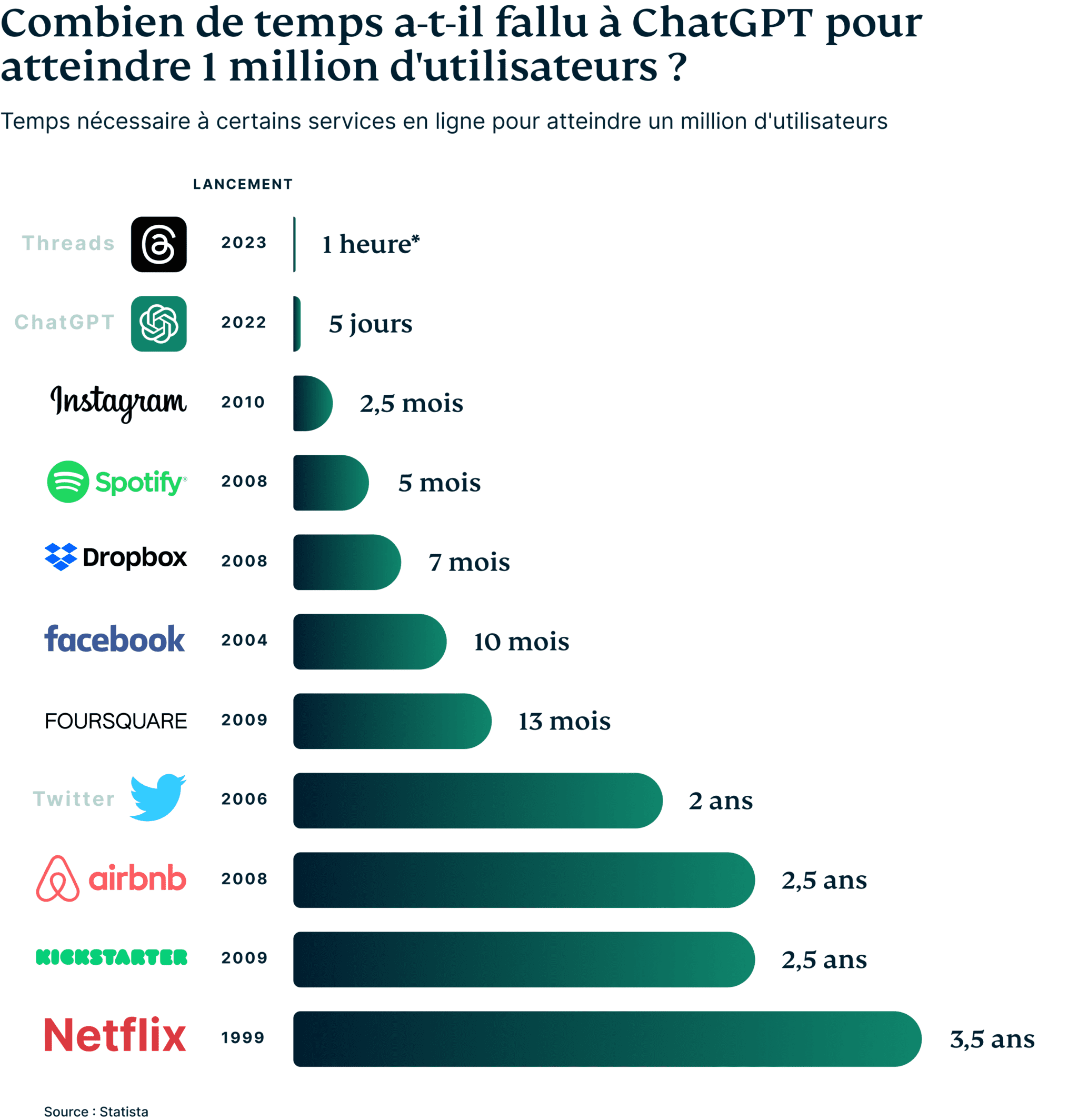 Seul Threads a connu une croissance aussi spectaculaire, atteignant un million d'utilisateurs une heure à peine après son lancement. À titre de comparaison, il a fallu 2,5 mois à Instagram, deux ans à Twitter (aujourd'hui X) et 3,5 ans à Netflix pour atteindre le même nombre d’utilisateurs.