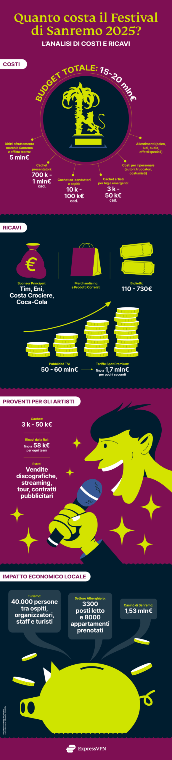 Secondo alcune stime, nelle ultime edizioni del Festival i costi di produzione si sono assestati intorno ai 17 milioni di euro annui. Una cifra lievitata nel corso del tempo soprattutto per ampliare la caratura dell’evento, dotandolo di scenografie di spessore e tecnologie avanzate. Il Teatro Ariston è il cuore pulsante della kermesse: a cadenza annuale, il costo per l’affitto della struttura si aggira intorno ai 5 milioni di euro e comprende, oltre al nolo, la preparazione logistica e la sicurezza. Vi è poi un elenco di spese di allestimento che vale una fetta considerevole del budget. Palco, luci e schermi a LED, sistemi audio, effetti speciali, arredi, telecamere, droni per le riprese aeree e tante altre attrezzature audiovisive di ultima generazione necessitano di investimenti sostanziosi in progettazione, materiali e personale tecnico.