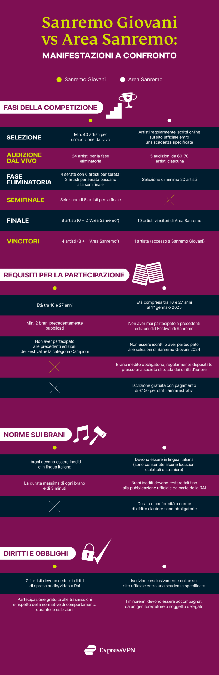 Insomma, un evento imperdibile per tutti, dagli italiani all’estero agli stranieri appassionati di musica italiana! Quest’ultimi non possono perdersi questo appuntamento lasciandosi scoraggiare dalle restrizioni geografiche: per questo, ancora una volta, sottolineiamo la necessità di installare una VPN per garantire la privacy durante la navigazione e per accedere a tutti i contenuti nell’universo della kermesse.