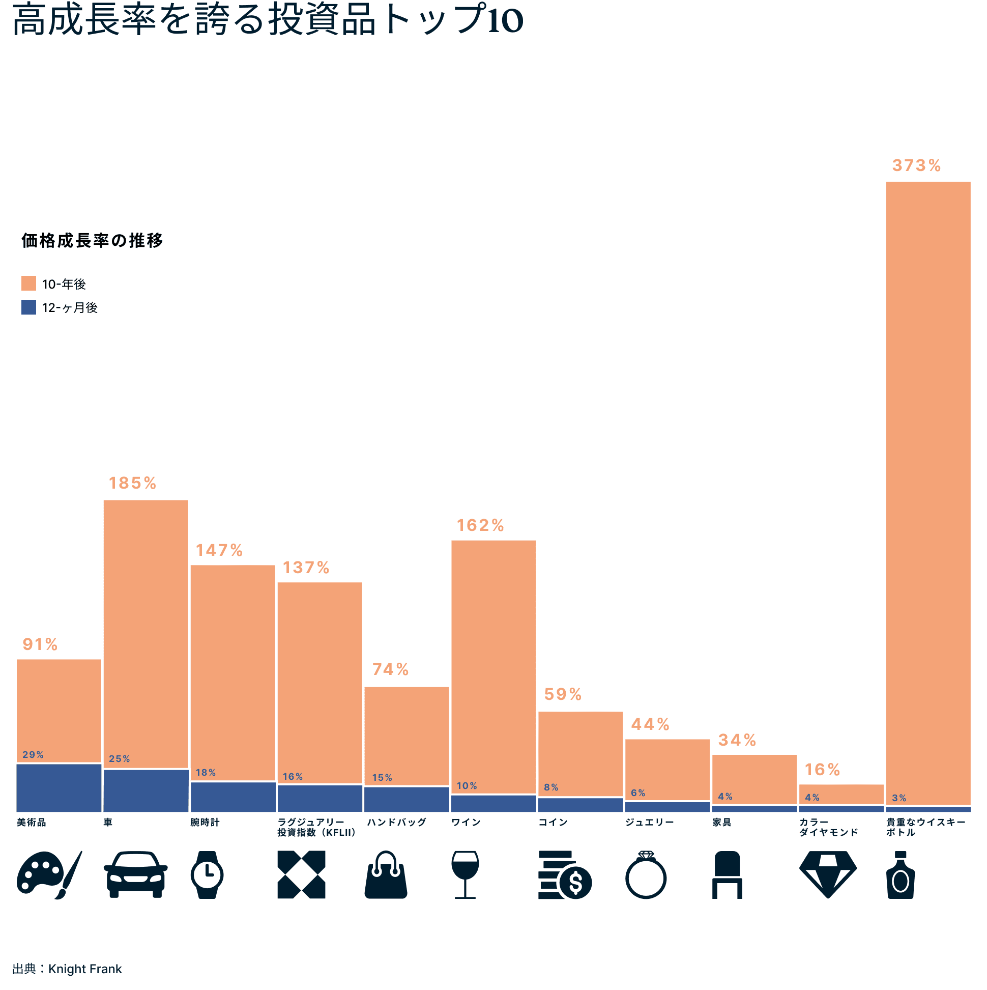 - 希少なウイスキー、美術品、高級品、車などのコレクション(実物資産)への投資は、ビットコインに比べて比較的安定しており、高いリターンが期待できる