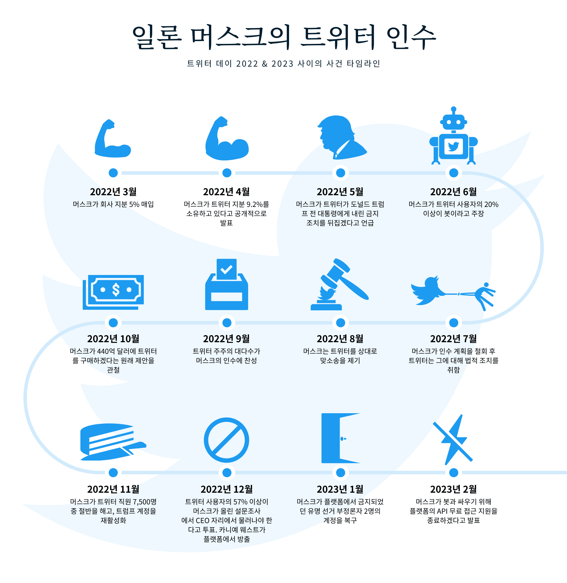 - 2023년 2월 9일: 트위터는 블루 구독자에게 4,000자 트윗을 도입하고 광고를 절반으로 줄였니다.