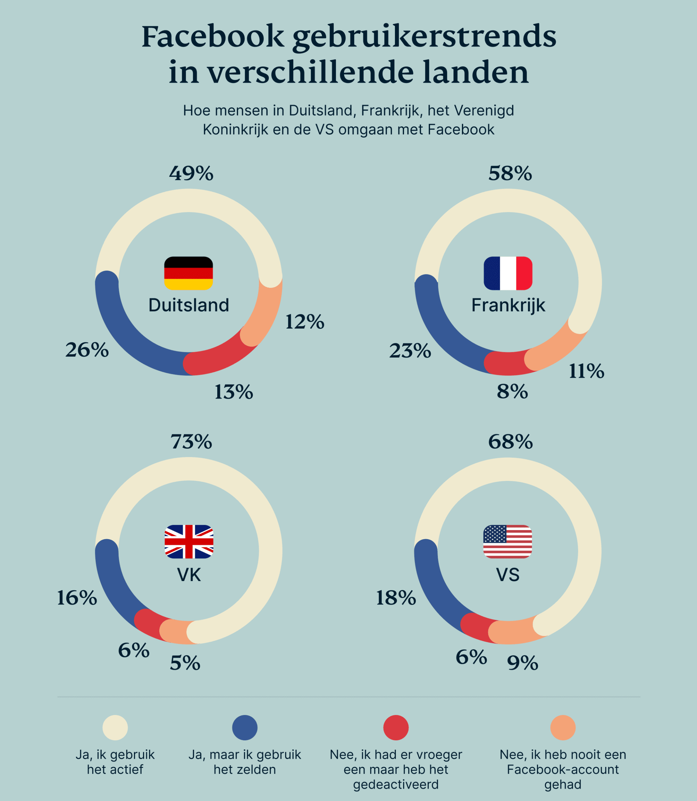 Facebook mag dan nog steeds een wereldwijde gigant zijn, een diepere blik onthult duidelijke verschillen. In het VK zegt 73% van de respondenten dat ze het platform actief gebruiken. De VS volgt met 68% van de gebruikers die regelmatig inloggen. Frankrijk en Duitsland blijven achter met respectievelijk 58% en 49%. Toch trekken zelfs in deze regio’s steeds meer gebruikers zich terug. Maar liefst 26% van de Duitsers en 23% van de Fransen geven aan dat ze hun accounts nauwelijks nog gebruiken.