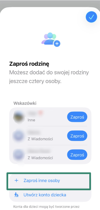 - Jeśli Twoje dziecko ma już konto Apple, stuknij Zaproś innych, aby zaprosić je do grupy rodzinnej.