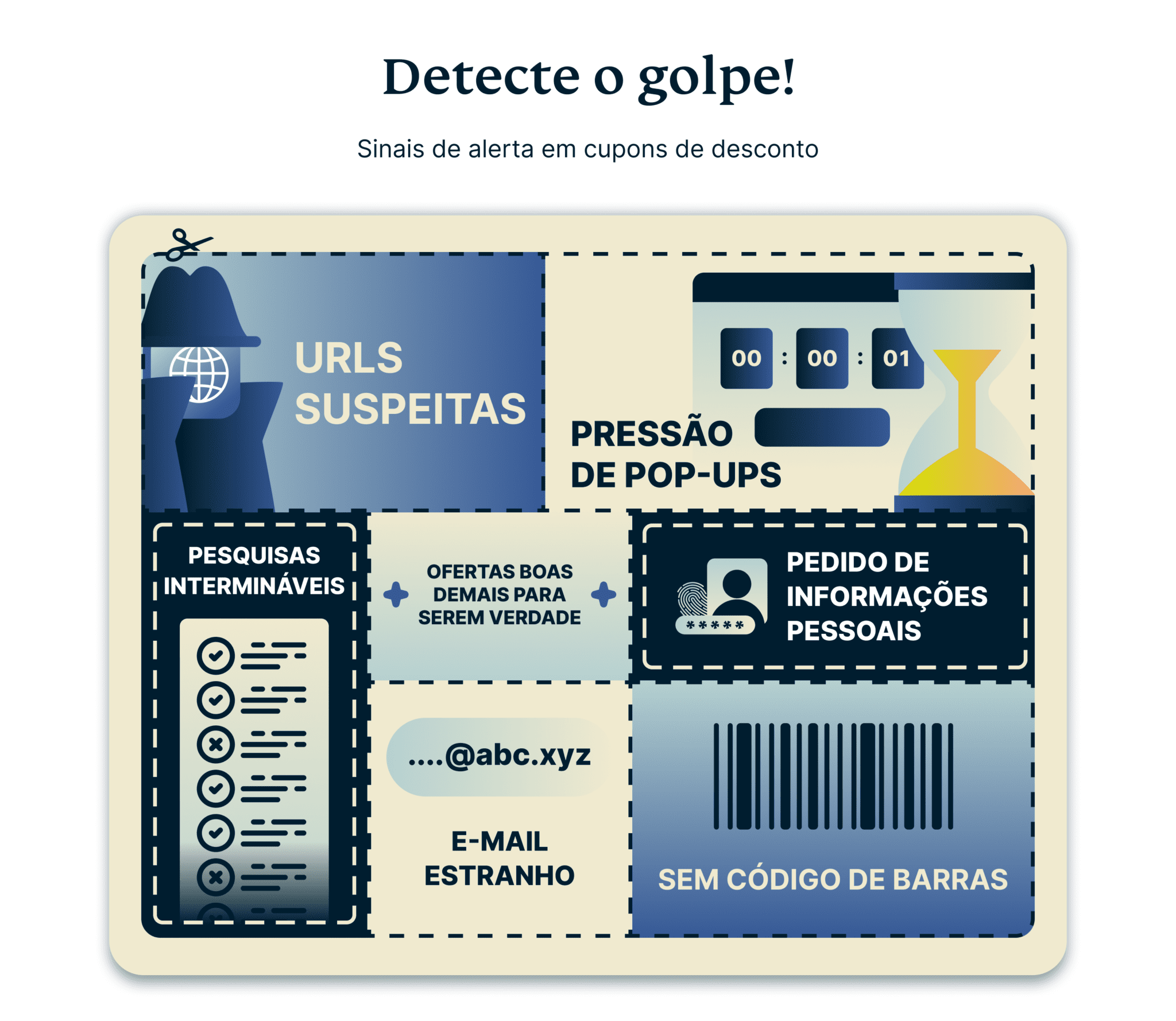 Você está em uma missão para encontrar as melhores ofertas de fim de ano, e um site promete ter todos os cupons mais quentes em um só lugar. Mas o que parece ser um serviço útil é, na verdade, um golpe. Sites falsos de agregadores de cupons atraem você com a promessa de conveniência, mas depois o direcionam para sites fraudulentos projetados para coletar suas informações pessoais. Em vez de um tesouro de descontos, você acaba entrando em uma armadilha de golpes.