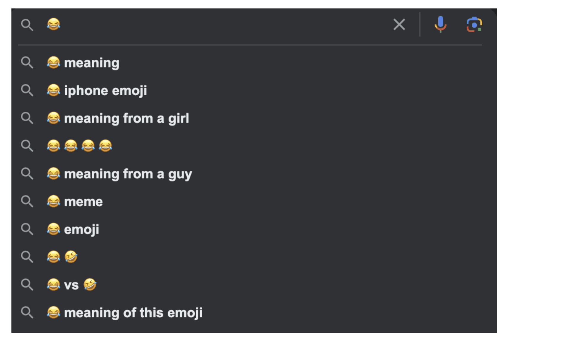 Os emojis também têm uma gama diversificada de interpretações, dependendo da pessoa que os vê, levando à crença generalizada de que eles carregam conotações ocultas. Por exemplo, esta é a pesquisa preditiva que aparece para o emoji 😂:
