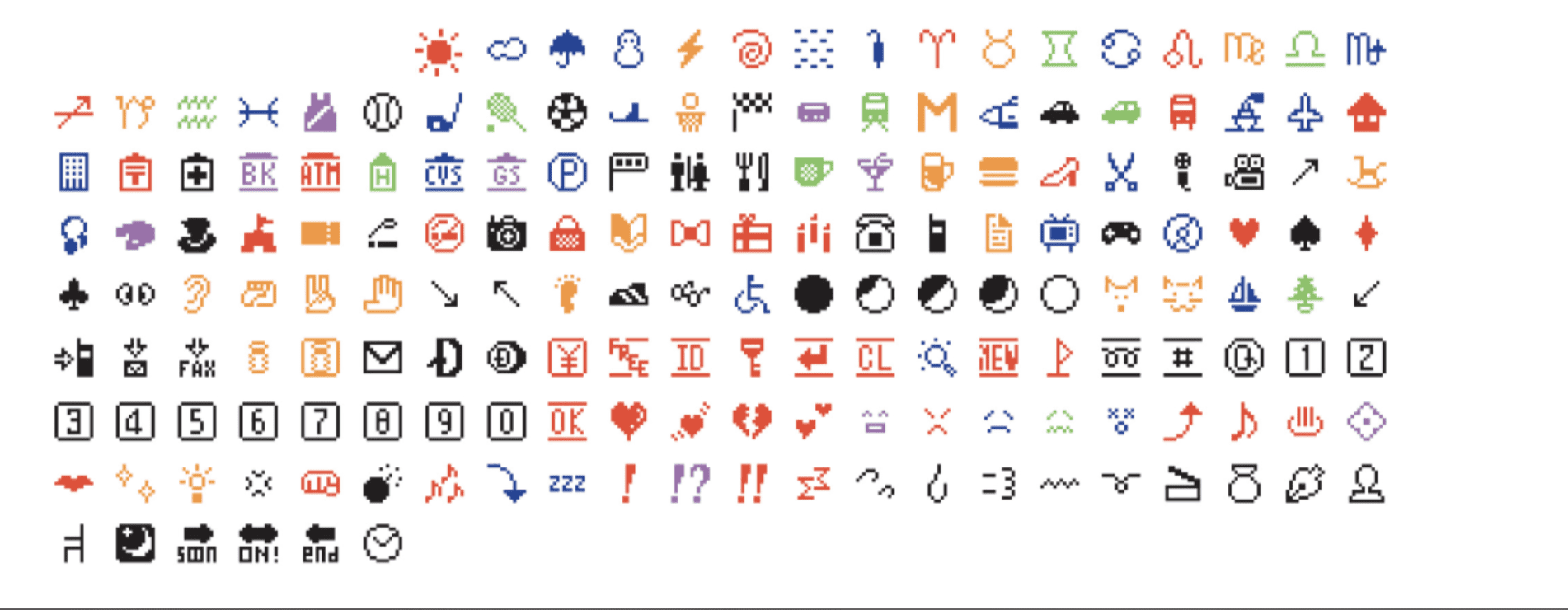 Os emoticons abriram caminho para o artista japonês Shigetaka Kurita, que trabalhou para a operadora de celular DOCOMO, para criar os primeiros 176 emojis em 1999. Sua versão inicial (abaixo) apresentava caracteres relacionados ao clima, tecnologia e itens do dia a dia.