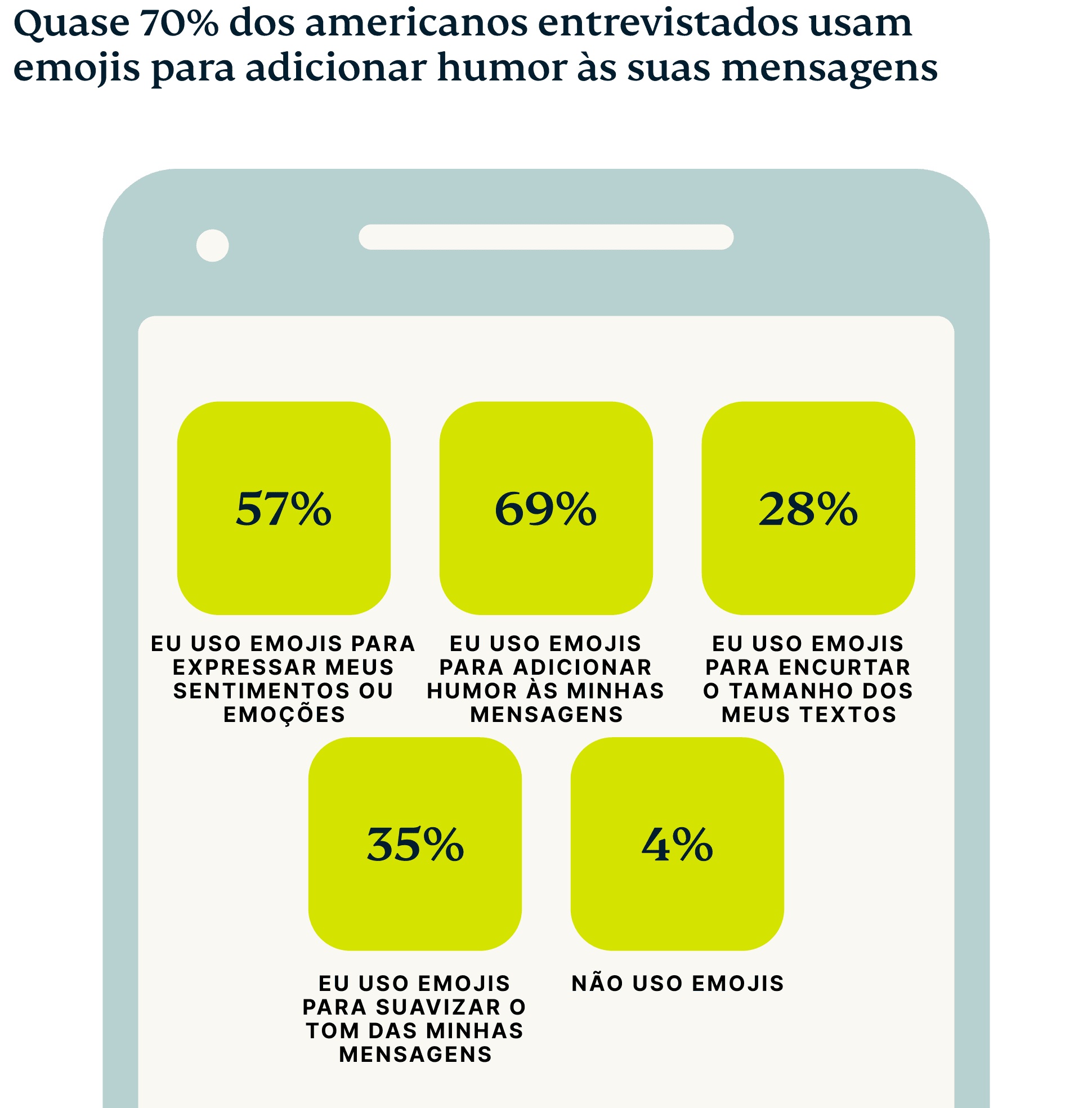 Mais da metade (51%) dos americanos disse que não acredita que os emojis atenuem o impacto das notícias ruins — um sentimento mais comum nos EUA do que na França, Alemanha ou Espanha. No entanto, mais da metade compartilha que também usou emojis para esconder como se sente.