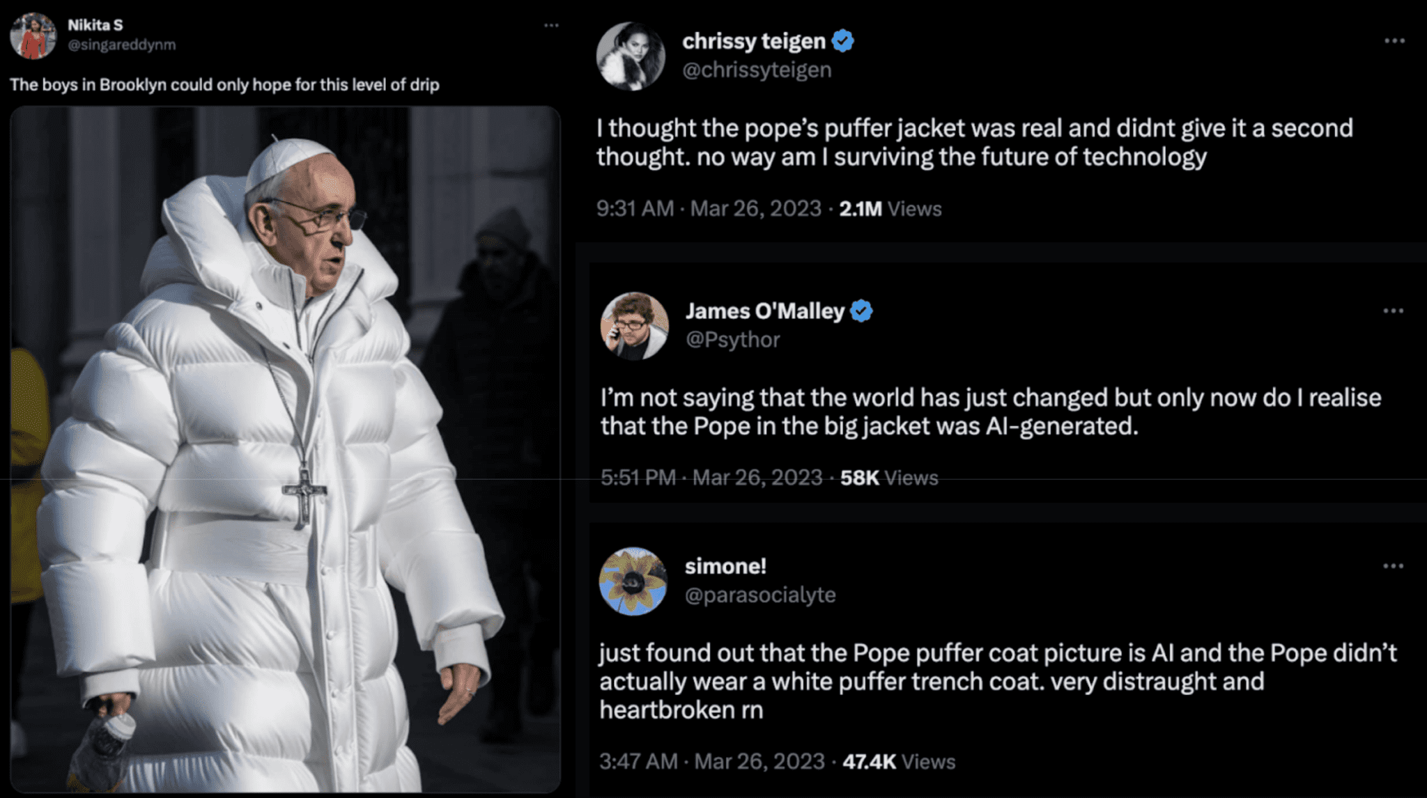 A tecnologia avançou a tal ponto que esses deepfakes podem ser quase indistinguíveis do conteúdo real sem uma análise especializada. Por exemplo, lembra-se daquelas fotos falsas geradas por IA do Papa Francisco em um grande casaco branco que enganaram os usuários online no ano passado?