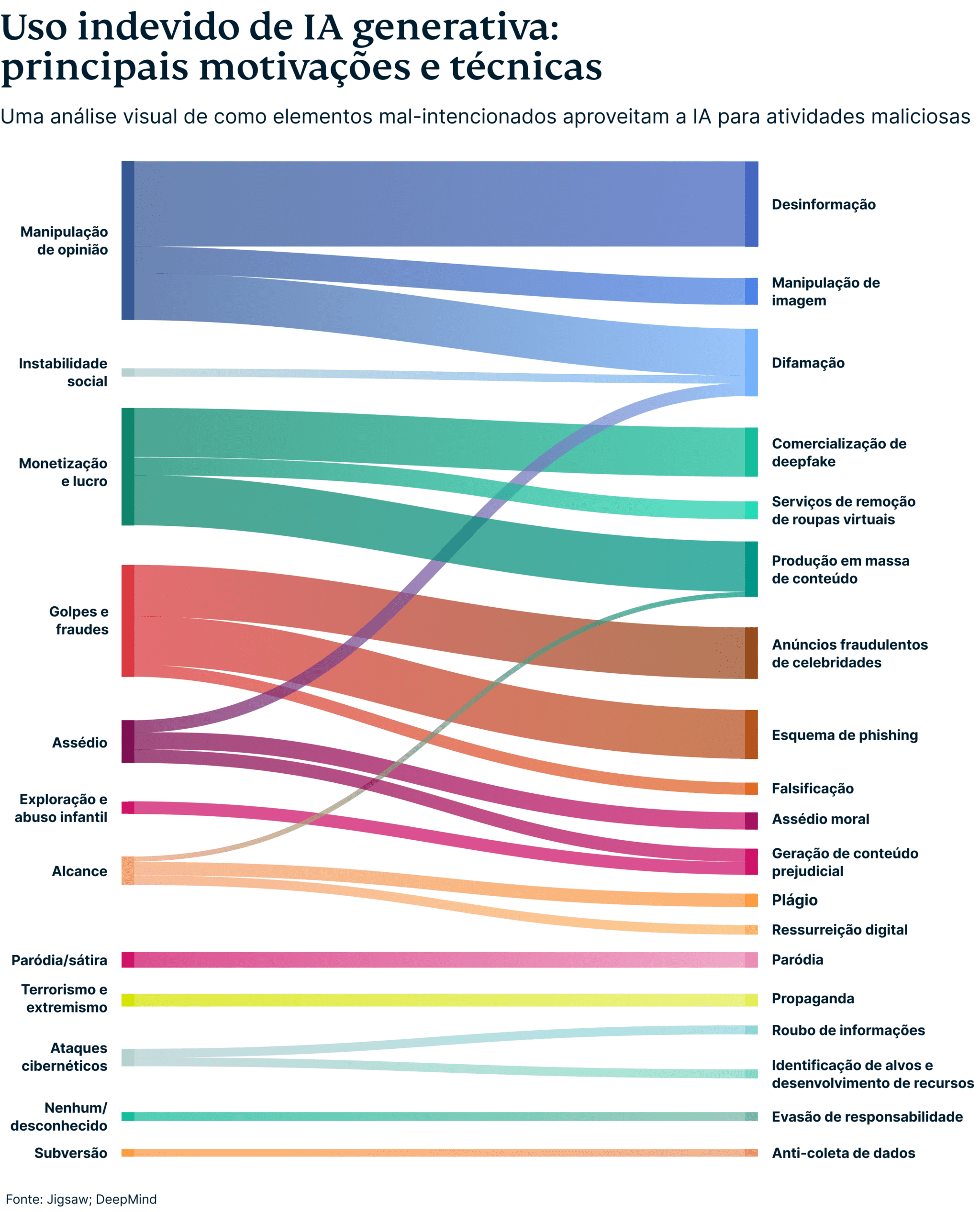 Um estudo recente do Google DeepMind descobriu que influenciar a opinião pública é o objetivo malicioso mais comum do uso de IA generativa, principalmente por meio de mídia deepfake. Esta criação de imagens, vídeos e áudio de pessoas realistas, mas falsos foi quase duas vezes mais comum que o segundo maior uso indevido de ferramentas generativas de IA, que foi a criação de conteúdo online de desinformação baseado em texto.