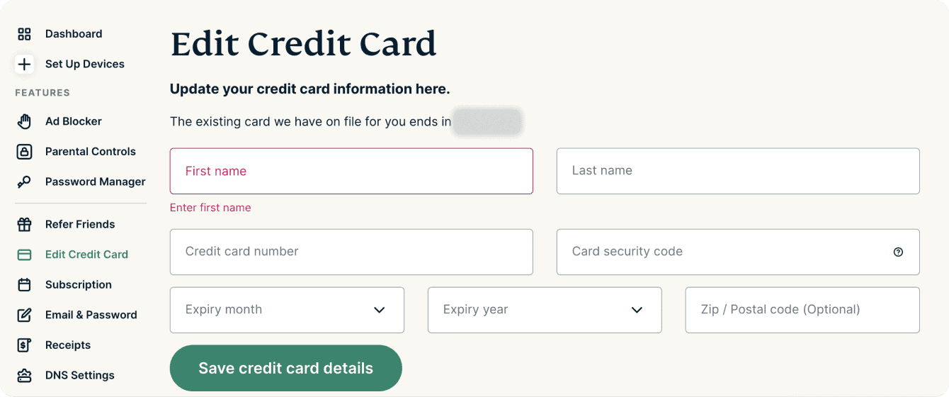 Você só poderá visualizar as informações do seu cartão de crédito nas configurações da sua conta se tiver adquirido sua assinatura anteriormente pelo site da ExpressVPN.