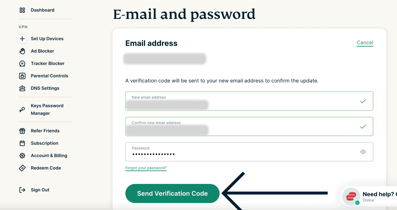 Once you have filled in the fields, select Send Verification Code. The 6-digit verification code will be sent to your new email address. The email will be titled, “Request to update ExpressVPN email address”.