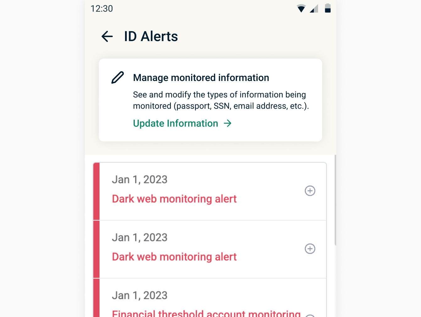 Early warning is critical, and ID Alerts monitors data in key areas of the internet to let you know if there’s activity that puts you at higher risk for identity theft.