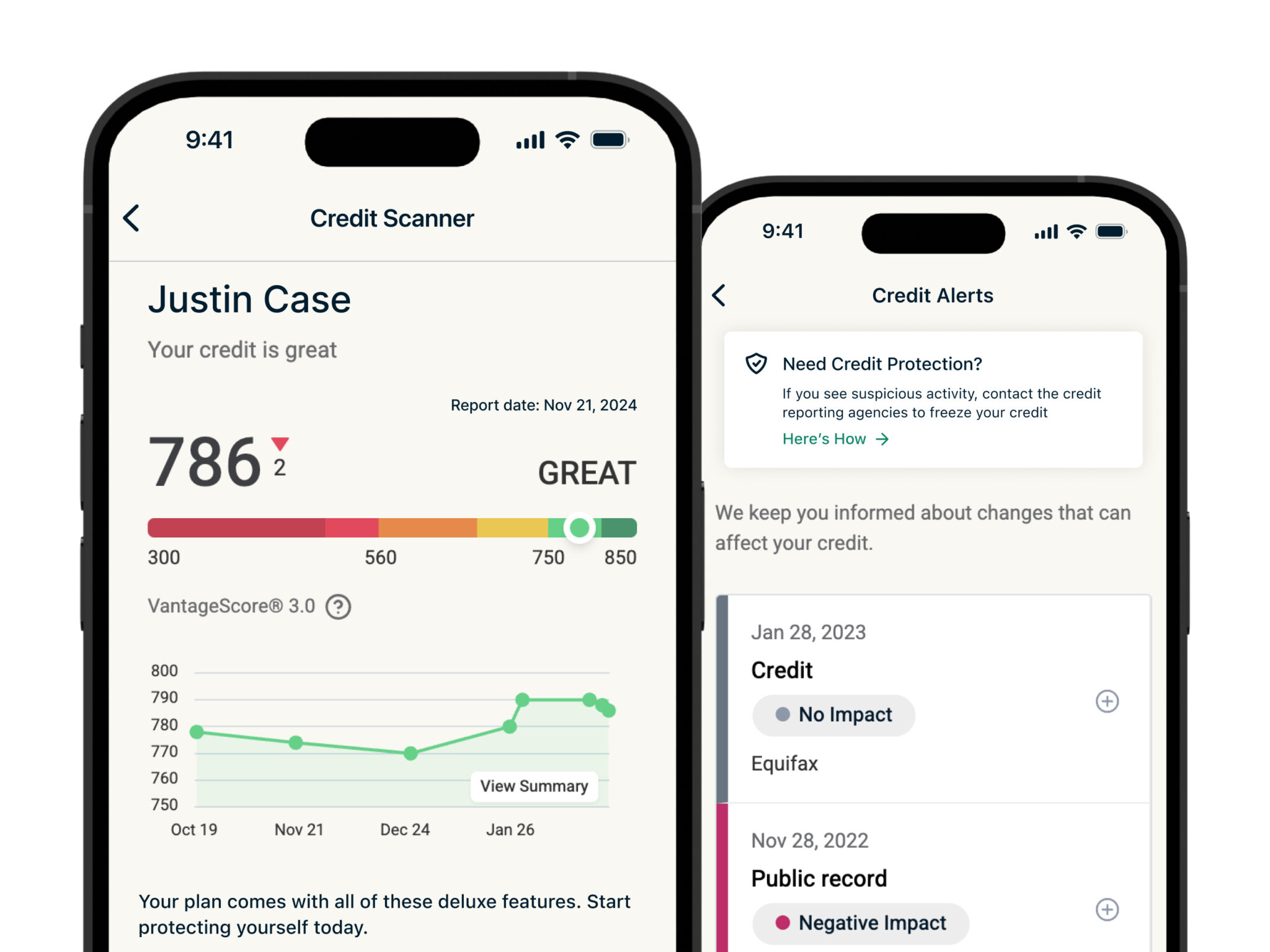 - Credit monitoring and alerts: Regular updates that list activity that can affect your credit.