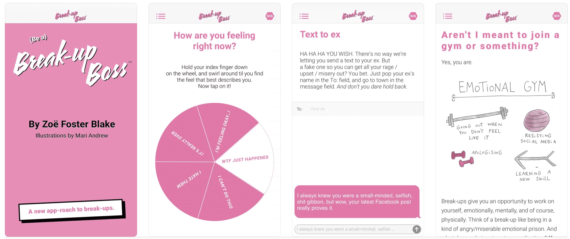 Break-up Boss, die Idee der Beziehungsautorin Zoë Foster Blake, ist eine Schulter zum Anlehnen für alle, die eine Beziehung beenden. Betrachten Sie die App als ein Selbsthilfebuch, vollgepackt mit praktischen Ratschlägen, Bestärkungen und sogar therapeutischen Spielen wie dem Verfassen einer fiktiven Nachricht an den Ex-Partner.