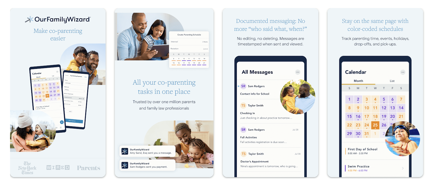 OurFamilyWizard wurde entwickelt, um Eltern bei der Kommunikation und dem Austausch zentraler, auf das Kind bezogener Informationen zu helfen. Die App dient als Plattform für Eltern, die die Details des gemeinsamen Sorgerechts bewältigen möchten. Die Eltern können die Aktivitäten des Kindes, den Kalender und die gemeinsamen Zeitpläne hochladen und verwalten, Ausgaben tracken, Gesundheits- und Bildungsdaten austauschen und sichere Nachrichten direkt über die Plattform verschicken, sodass eine persönliche Kommunikation nicht mehr erforderlich ist.