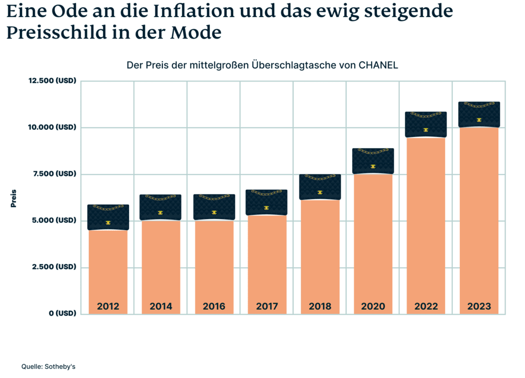 Auch Chanel-Taschen bestätigen einen erheblichen Preisanstieg im Lauf der Jahre, zuletzt im März dieses Jahres. Sotheby's berichtet, dass Chanel den Preis seiner klassischen Überschlagtasche, der Classic Flap Bag in der Größe Medium, um 16 % erhöht hat (auf ihrem Preisschild prangt nun ein Verkaufspreis von über 10.000 USD). Bei anderen beliebten Modellen wie der Coco Handle, der Chanel 19 und der Pearl Crush wurde der Preis ebenfalls angehoben, hier um 14 %.