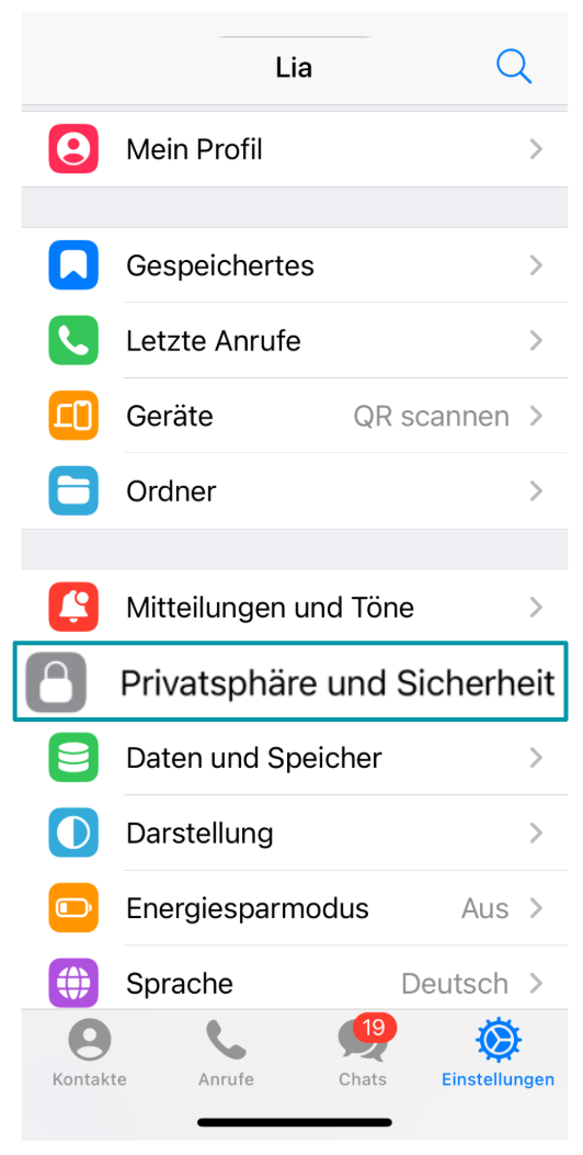 - Tippen Sie auf Datenschutz und Sicherheit. Hier können Sie bestimmen, wer Ihre Telefonnummer, das Foto Ihres Profils sowie den Status Zuletzt gesehen sehen kann. Schränken Sie den Zugriff auf Meine Kontakte statt auf Alle ein, können Sie Ihre privaten Daten besser schützen.
