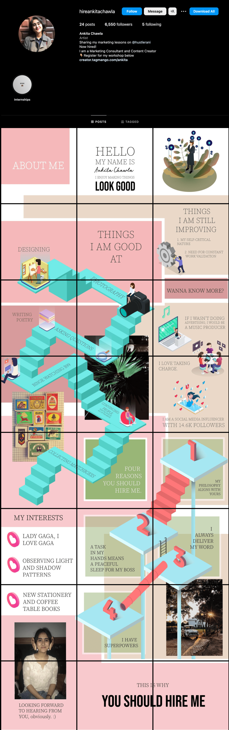 Ankita Chawla, eine Nutzerin aus Indien, verwandelte beispielsweise ihr persönliches Instagram-Konto in ein kreatives Schaufenster ihrer Fähigkeiten und Fertigkeiten. Sie gestaltete ihren Lebenslauf als Collage und postete ihn auf ihrem Profil, was dazu führte, dass sie als visuelle Gestalterin bei Deloitte Indien eingestellt wurde.