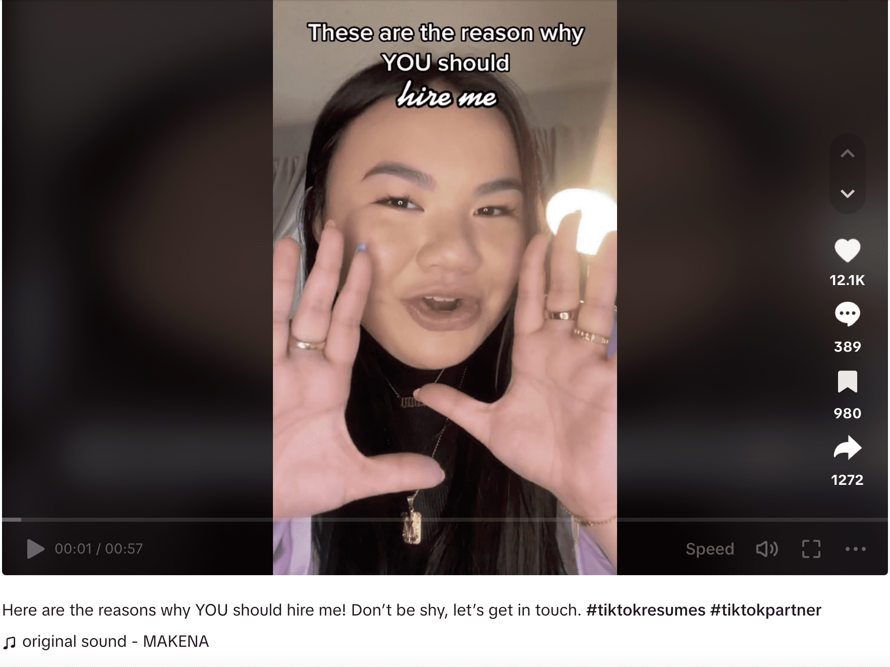 „Das sind die Gründe, warum Sie mich einstellen sollten“, sagt Makena Yee, eine 23-jährige Bewerberin aus Seattle – eine der Erfolgsgeschichten von TikTok Resumes. Nachdem ihr Lebenslauf-Video viral ging, sammelte sie Millionen von Aufrufen und Hunderte von Kommentaren, darunter Sätze wie „Stellt sie ein!“. Yee erhielt über 15 Jobangebote.