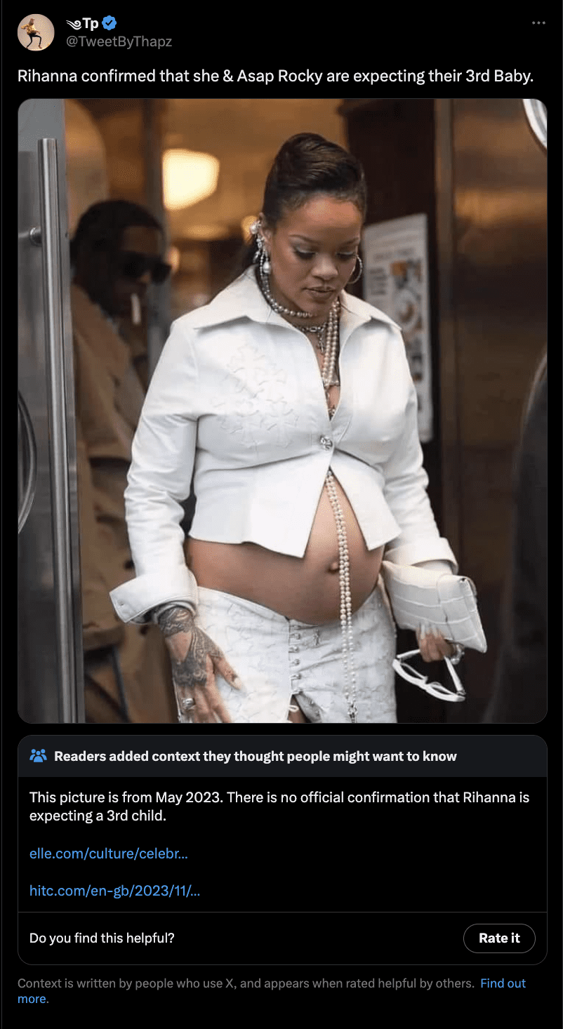Rihanna und Meghan Markle standen in diesem Jahr im Mittelpunkt von Baby-Fake-News, was ihnen die Plätze 5 und 6 auf unserem Index einbrachte. Ein Deepfake-Video, das fälschlicherweise zeigte, dass Rihanna mit ihrem dritten Kind schwanger ist, sorgte für viel Aufsehen. Obwohl sie im August 2023 ihr zweites Kind mit A$AP Rocky zur Welt brachte, verbreitete sich am Wochenende des Veteranentags schnell das Gerücht, sie erwarte bald darauf ein weiteres Baby, was jedoch nicht stimmte.