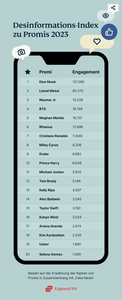 Auch Promis werden nicht von Fake News verschont. In diesem Jahr zeigt der ExpressVPN Desinformationsindex 2023 eine überraschende Reihe von Prominenten, von BTS über Taylor Swift bis hin zu Lionel Messi, die in das Kreuzfeuer gefälschter Berichte geraten sind. Unsere Analyse, die auf den Social-Media-Erkenntnissen von Buzzsumo basiert, zeigt, wie diese prominenten Persönlichkeiten unbeabsichtigt zu den Gesichtern von Falschmeldungen werden.