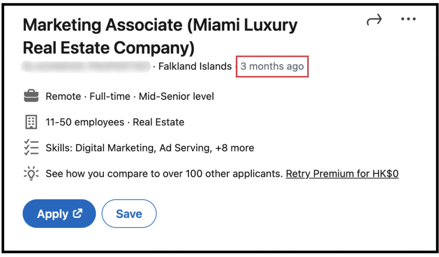 Le problème ne se limite pas aux offres d'emploi fantômes. LinkedIn et d’autres sites internet similaires sont également des espaces de prédilection pour les escrocs. De faux recruteurs peuvent publier de fausses offres d'emploi afin de collecter des informations personnelles auprès de demandeurs d'emploi peu méfiants. Ils peuvent aussi utiliser le prétexte d'une offre d'emploi afin d'inciter des personnes à envoyer de l'argent pour une formation ou des appareils, sans pour autant leur offrir un véritable emploi au bout du compte.
