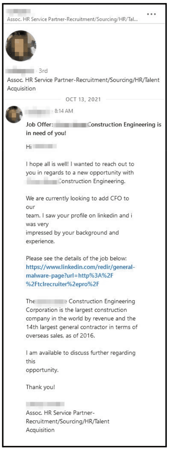 Attention aux arnaques sur LinkedIn : une fausse offre d'emploi provenant d'une entreprise, avec un lien suspect contenant le mot « malware »