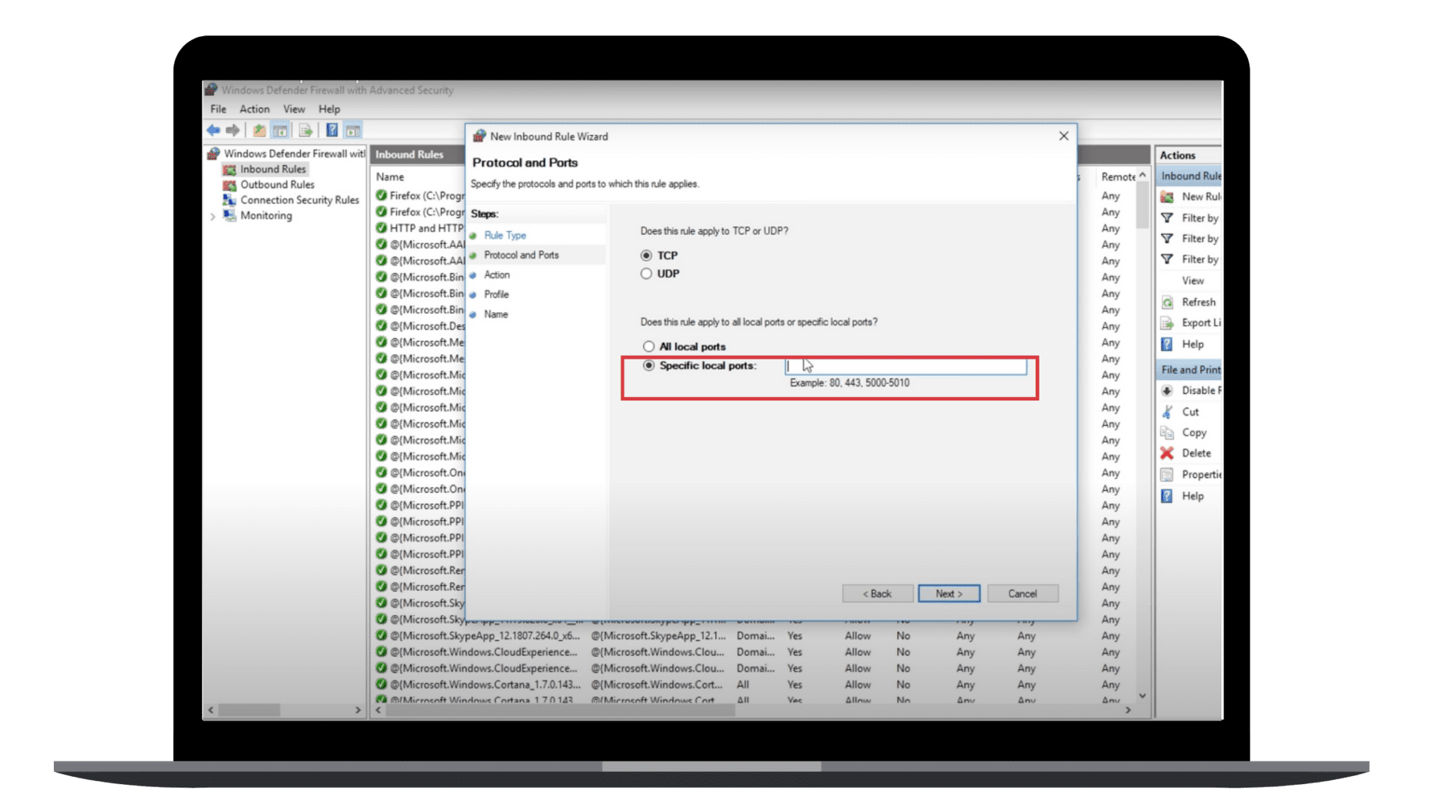 5. Sélectionnez TCP et Ports locaux spécifiques. Dans la case Ports locaux spécifiques, entrez 443 et cliquez sur Suivant.