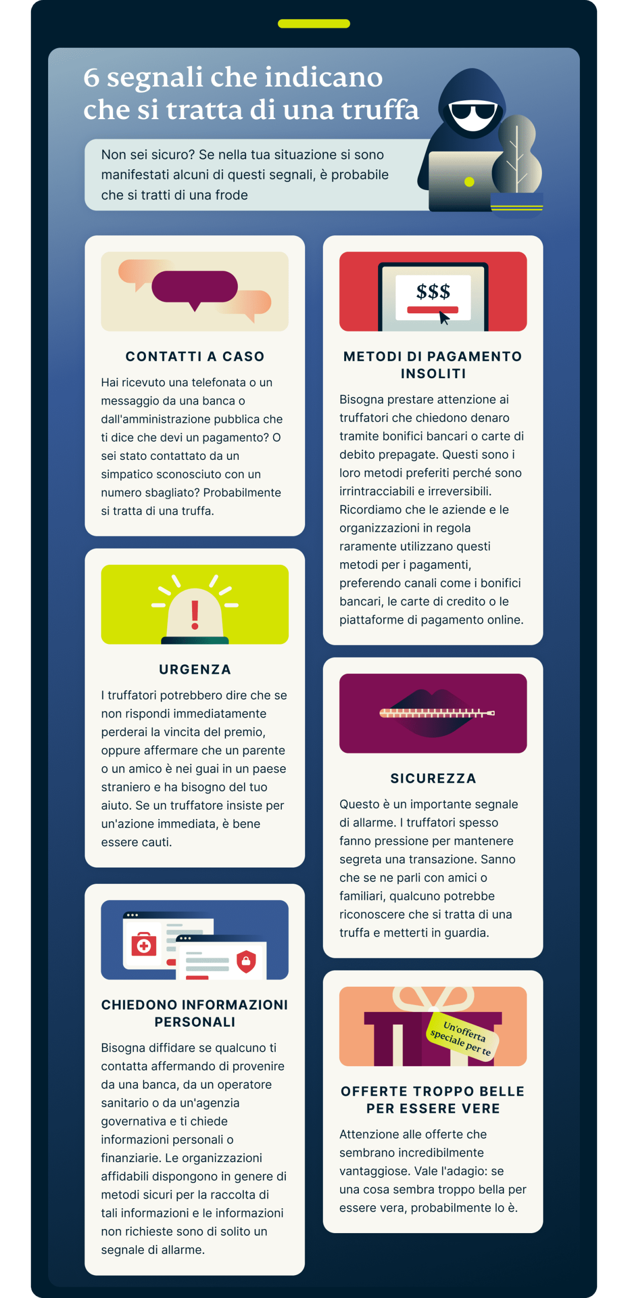 Riconoscere i segnali di una truffa è fondamentale per proteggersi dal rischio di caderne vittima. Ecco alcuni segnali di allarme da tenere d'occhio: