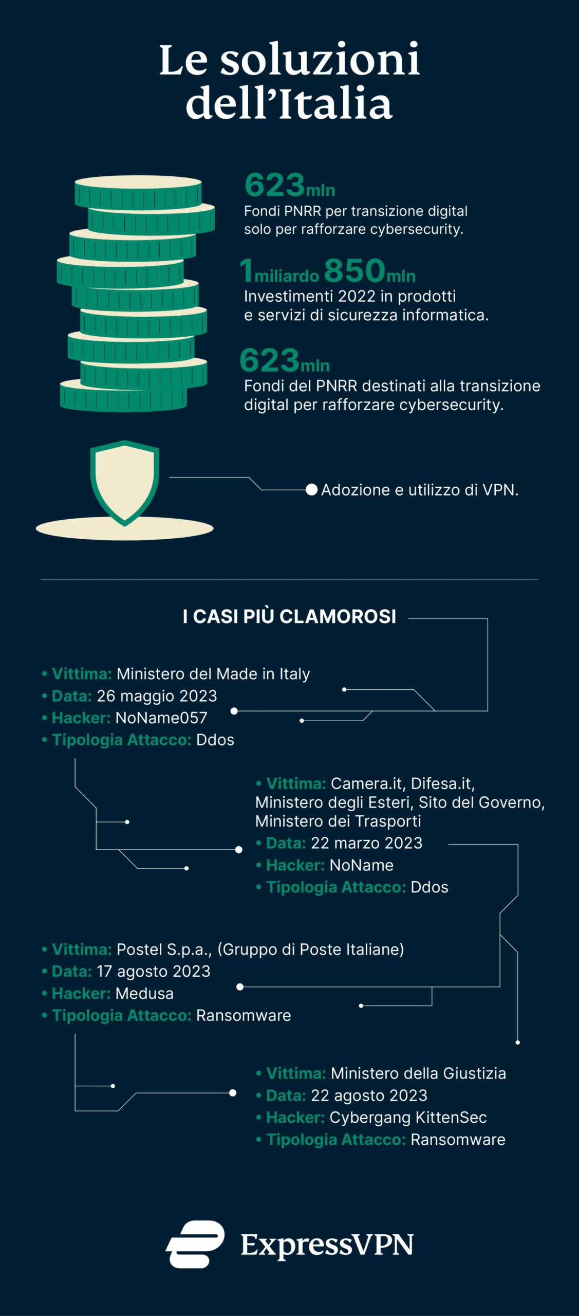 Pare chiaro dunque che l’Italia sia ormai entrata a pieno titolo, almeno come bersaglio, nella guerra cibernetica diffusa. Davanti alla nuova sfida il Governo ha stanziato una serie di risposte, possibili soluzioni all’inedito problema. La strategia consiste nell’aumentare i fondi destinati alla crescita digitale e alla cybersecurity: ecco dunque che 623 milioni dei fondi previsti dal PNRR saranno utilizzati solo per rafforzare la sicurezza cibernetica, mentre un altro miliardo e 850mila euro è stato speso nel 2022 in investimenti per prodotti e servizi informatici. Al di là del vil denaro, l’Italia sta comunque adottando anche alcuni provvedimenti strategici, come l’utilizzo di VPN, add something else also here, what other solutions, tips and tricks for normal users.