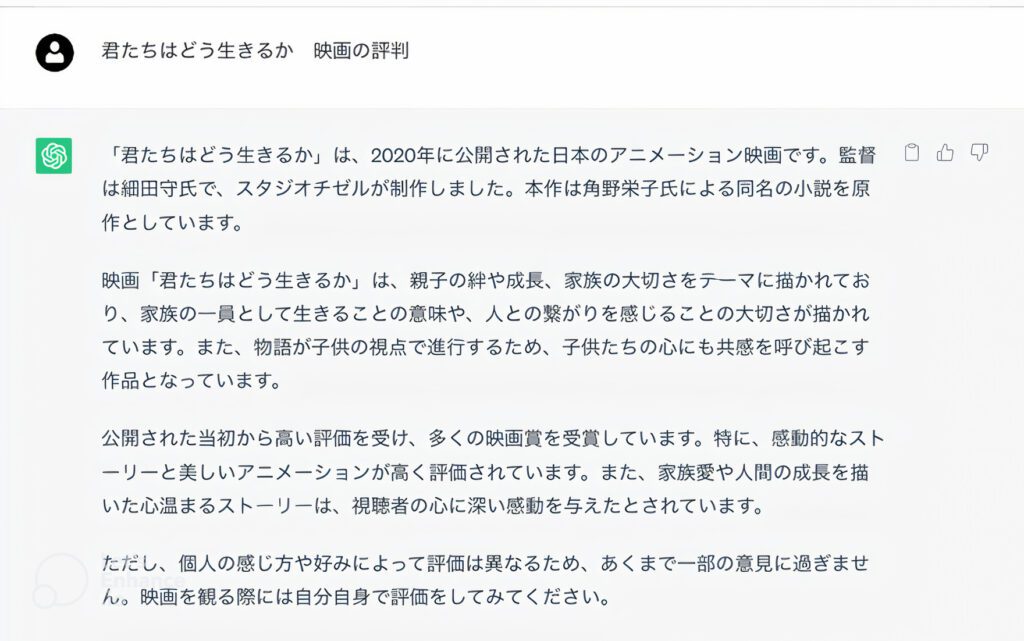 「君たちはどう生きるか」は2023年7月14日に公開された宮崎駿監督のアニメ作品です。そのため、上記のChatGPTとBingの解説はどちらも間違っていることが分かります。