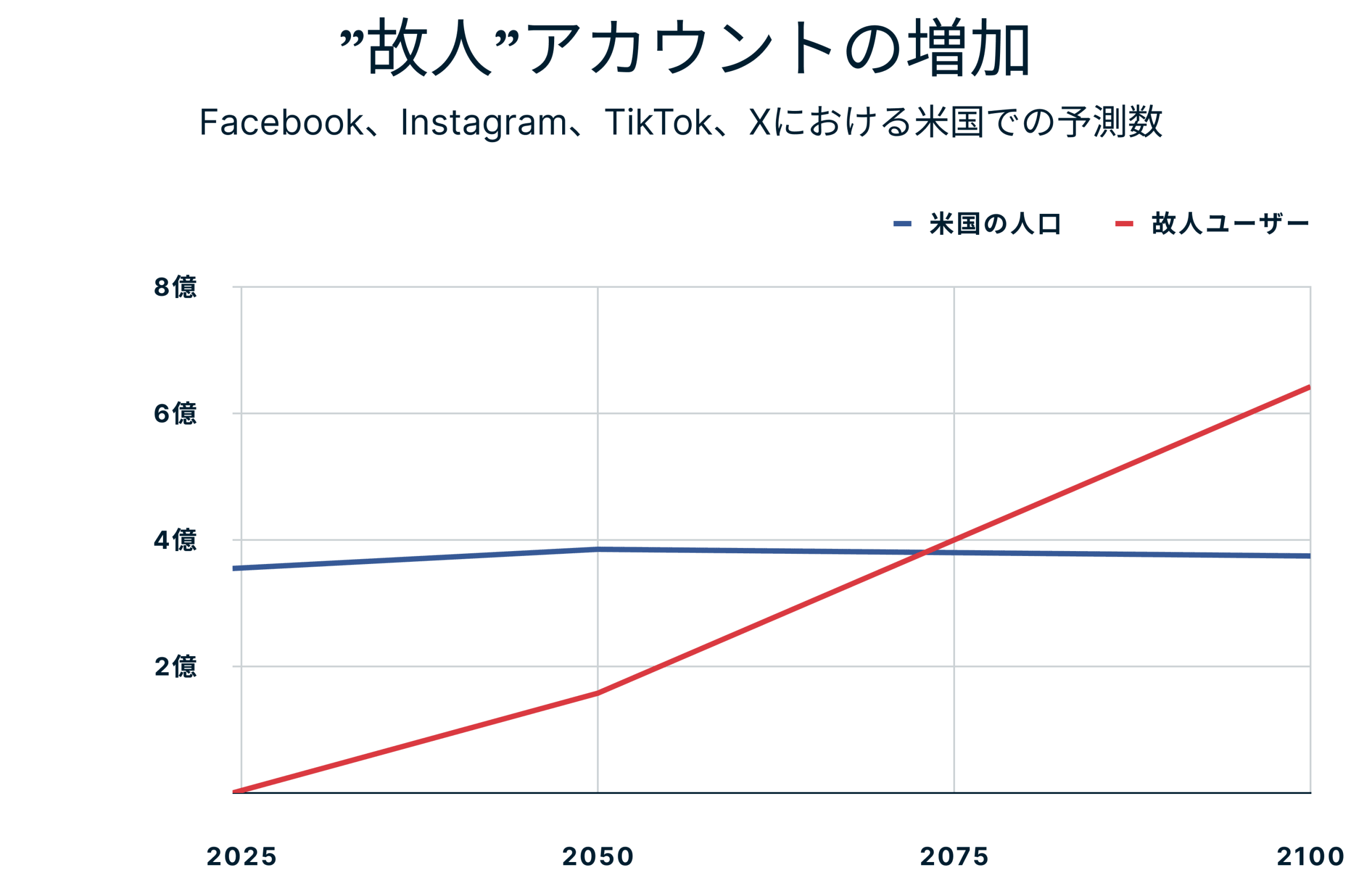 アメリカでは、2100年までにフェイスブックが最も多くの故人アカウントを持つようになると予測されており、その数は推定2億7,860万人に上ります。この数の多さは利用者の多さを反映しており、デジタルな思い出の主要な保管場所にもなっているためです。