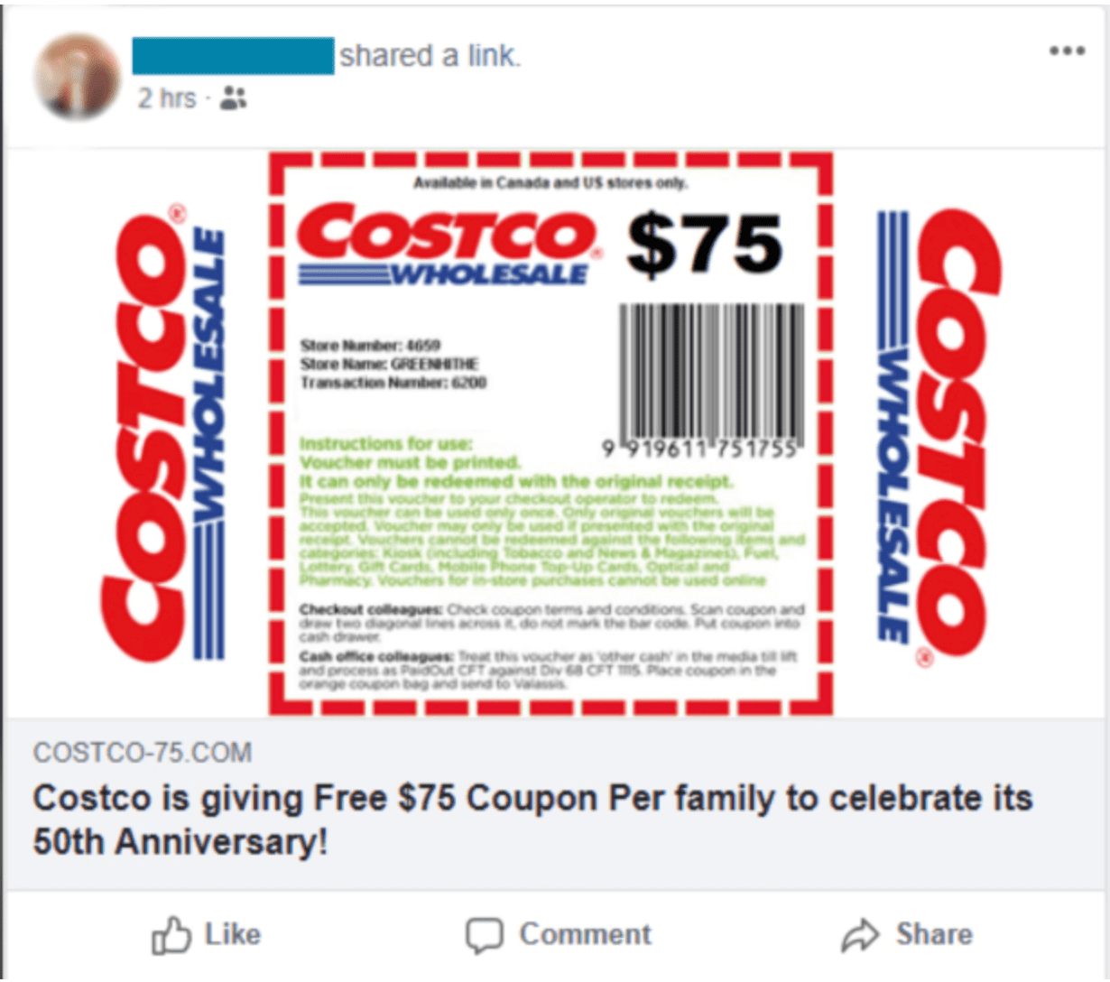 Przykład fałszywego kuponu na Facebooku, w której oszuści promowali nieistniejącą ofertę zniżkową Costco, aby oszukać użytkowników. Źródło: Facebook