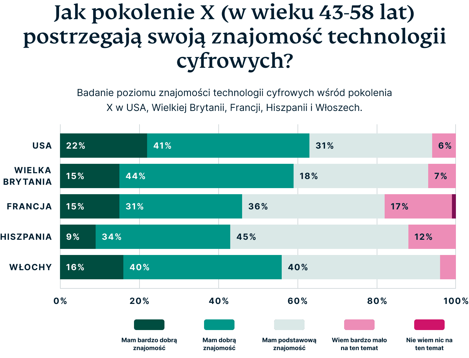 W przypadku młodszych boomersów (59-68 lat) różnica w znajomości technologii jeszcze bardziej się pogłębia. W krajach takich jak Francja i Hiszpania wyniki są alarmujące – mniej niż jedna trzecia ankietowanych czuje się pewna swoich umiejętności technologicznych. Nawet w krajach takich jak USA i Wielka Brytania, gdzie znajomość technologii jest generalnie wyższa, tylko około połowa osób w tej grupie wiekowej czuje się komfortowo z technologią.