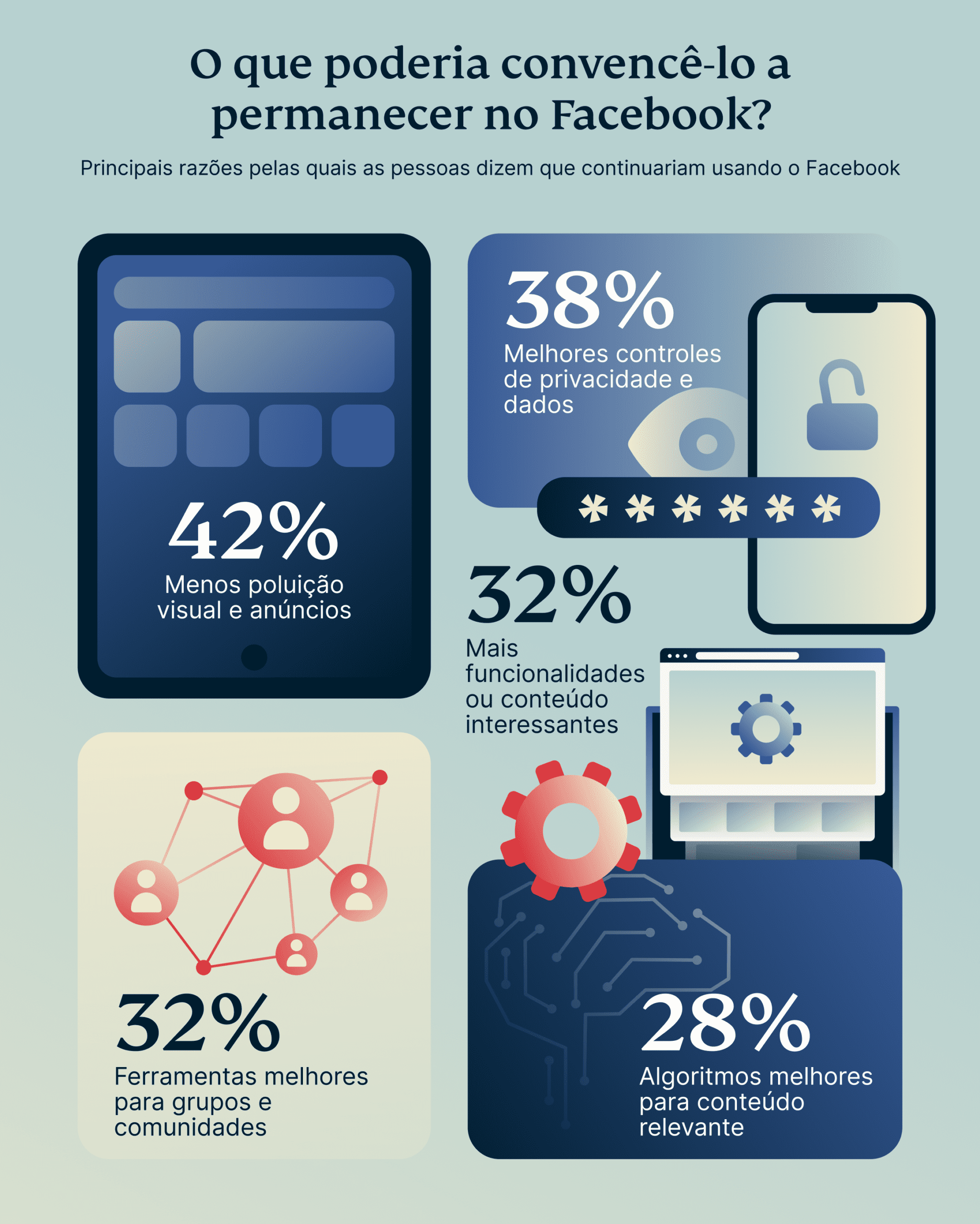 Para os usuários de 25 a 34 anos, o Facebook parece cada vez mais ultrapassado. Metade (50%) prefere outras plataformas e 29% dizem que não precisam mais do Facebook. Diferente dos usuários mais jovens da Geração Z, as preocupações com privacidade têm um peso maior para esse grupo, com 19% citando-as como um fator-chave. No entanto, os principais motivos para o afastamento permanecem os mesmos: 33% apontam a redução da atividade de seu círculo social e 29% afirmam que anúncios irrelevantes e excesso de conteúdo publicitário os desmotivam a continuar usando a plataforma.
