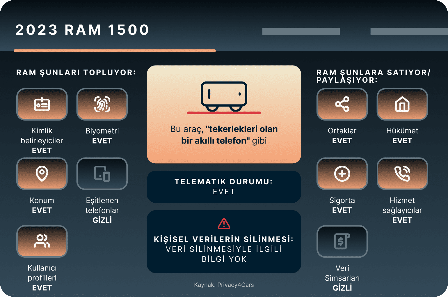 - ABD merkezli bir otomotiv şirketi olan Privacy4Cars, bu yılın başında sürücüleri araçlarının topladığı verilerin kapsamı hakkında bilgilendirmek amacıyla Otomobil Gizlilik Raporu aracını sundu.
