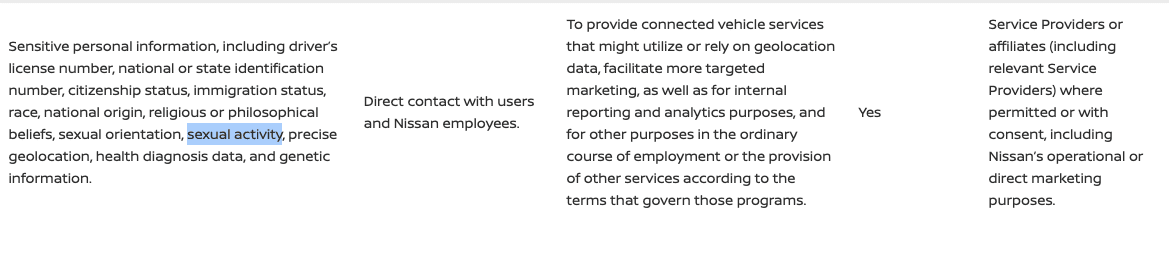 Bu veri toplama işlemi; adlar, adresler ve e-posta adresleri gibi kişisel bilgileri kapsıyor. Ayrıca parmak izi veya yüz hatları gibi biyometrik işaretleri de kapsıyor ve sürücünün nerede olduğunu takip ediyor. Politikasının eşitlenmiş telefon verileriyle ilgili cümlelerinden anlaşıldığı kadarıyla, bu otomobil bireysel sürücü alışkanlıkları ve tercihlerine bağlı olarak kullanıcı profilleri oluşturuyor.